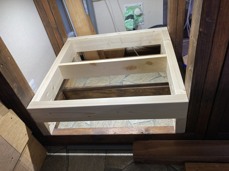 水槽台に合わせて、2×4材と1×4材を使用して土台を作成しました。