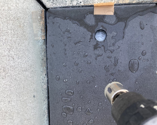 今回使用する水槽にはPPシートを貼り付けているため、カッターで穴をあける部分のみ切り取り、ガラスにホールソーが当たるよう処理しています。