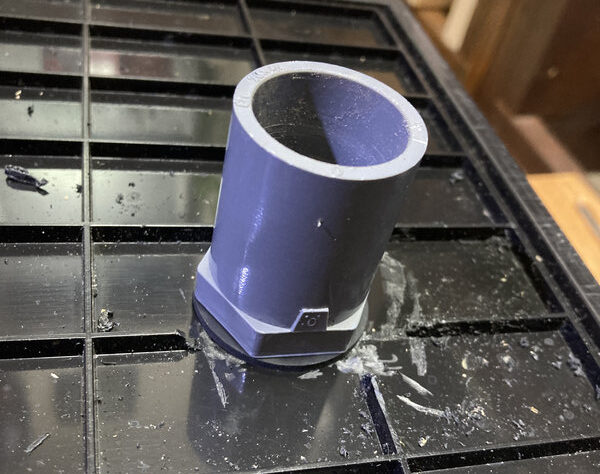 新水垂れ流し用の排水管に穴を空け、ソケットを接着し、シリコンで隙間を埋めています。