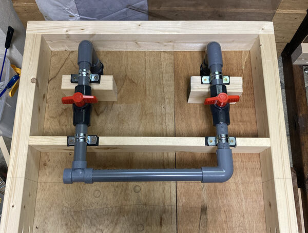配管は水槽台にビス止めし、バルブ開閉時の力がガラス水槽に直接伝わらないよう工夫しました。
